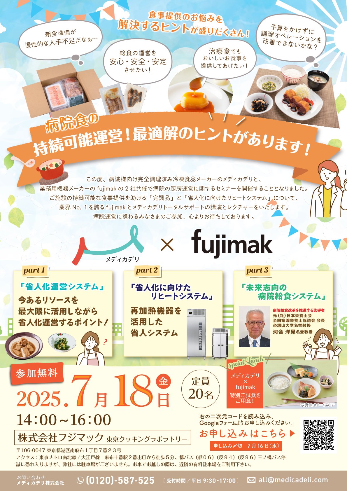この度、病院様向け完全調理済み冷凍食品メーカーのメディカデリと、業務用機器メーカーのfujimakの2社共催で病院の厨房運営に関するセミナーを開催することとなりました。