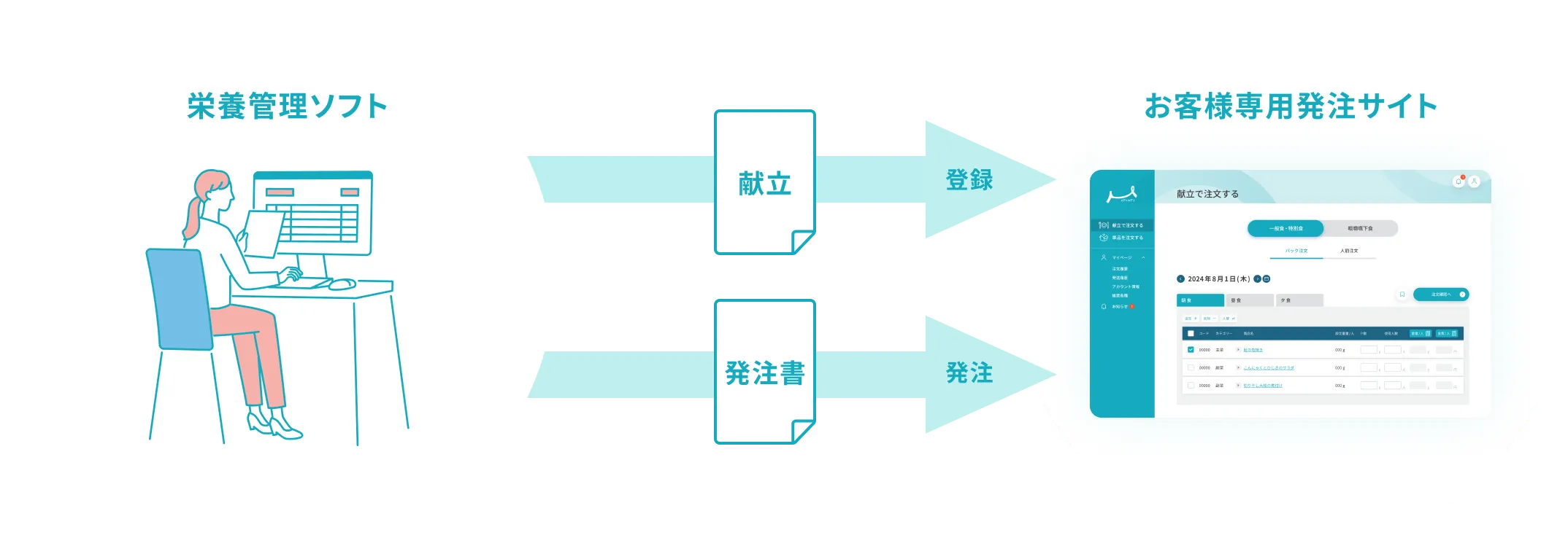 メディカデリの病院食サービスでは、栄養管理ソフトで作成したメディカデリ完調品の献立を発注サイトに登録しておけば、