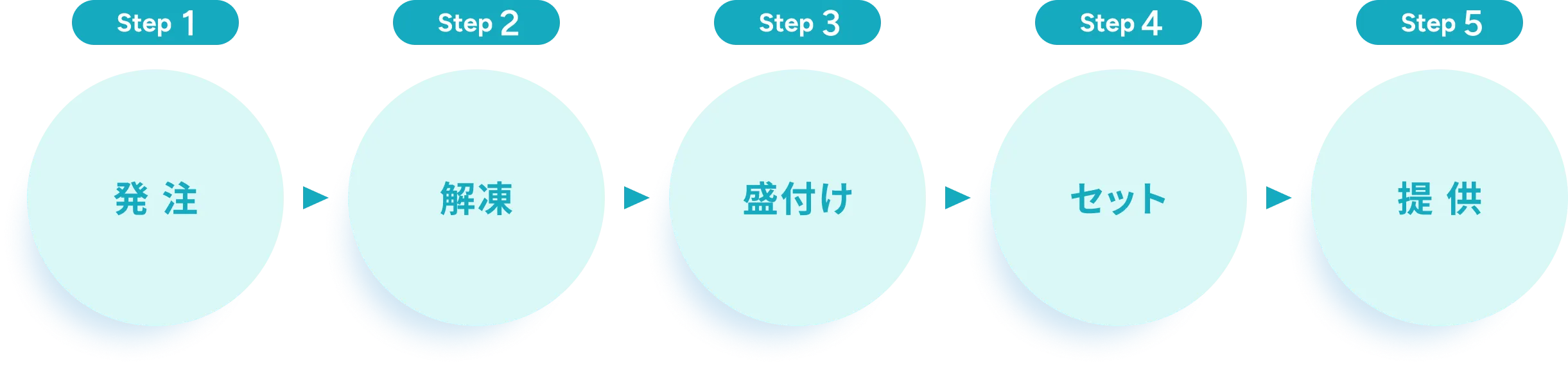 料理として完成された状態の食品なので、煩雑な発注や面倒な食材管理、大変で技術が必要な仕込みや調理もなく、発注、解凍、盛付け、セット、提供の最短5ステップで提供可能です。