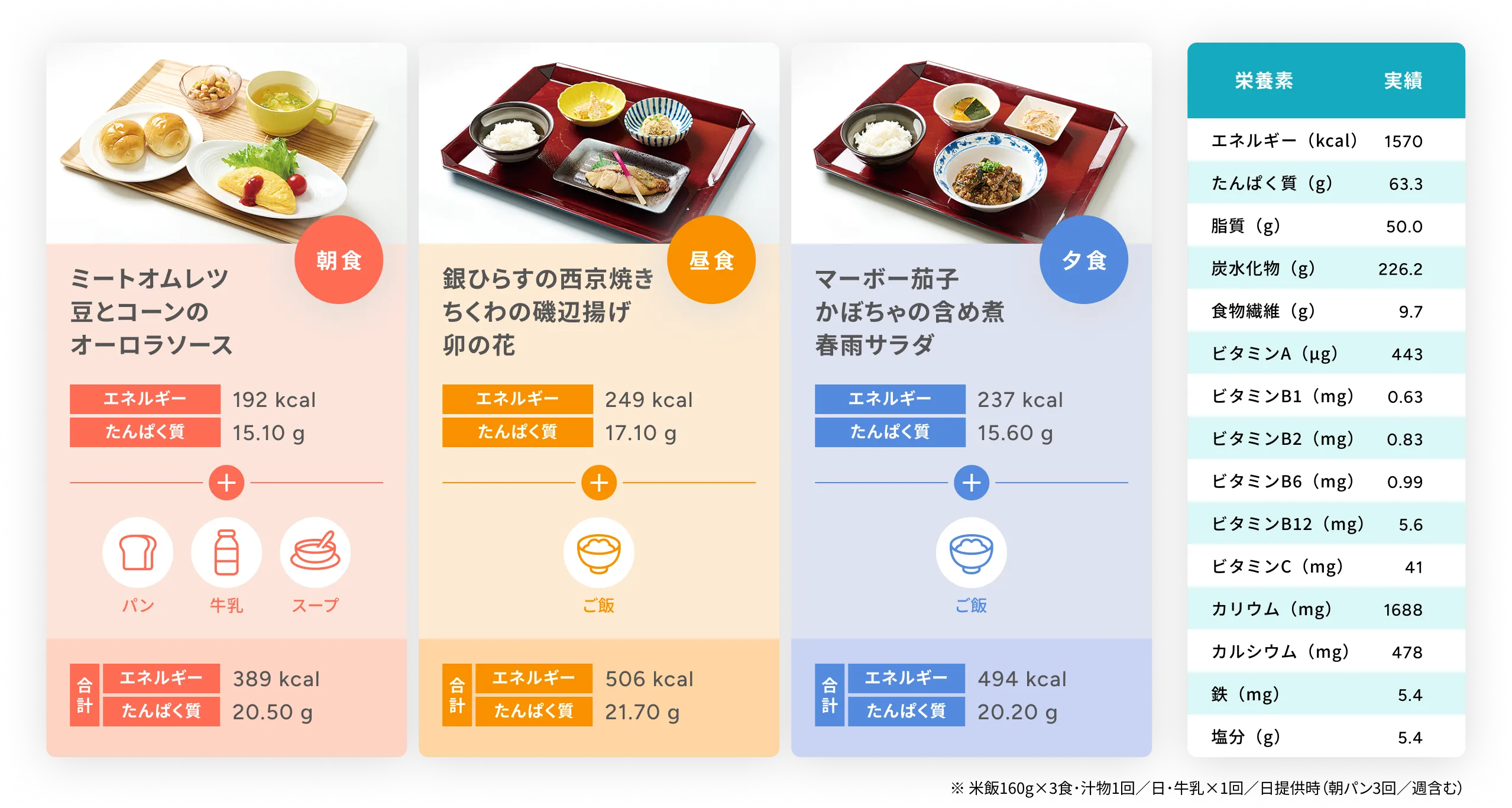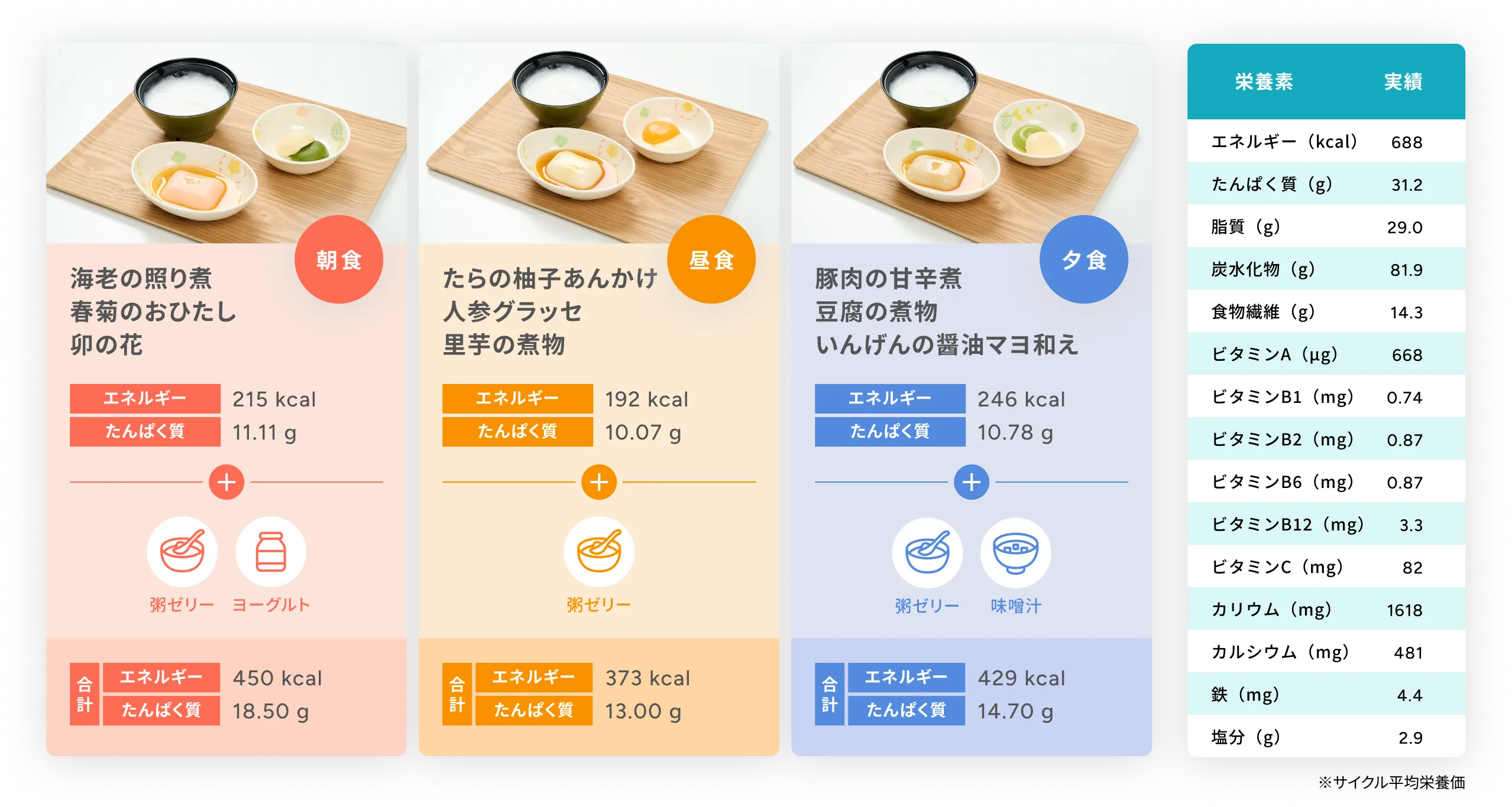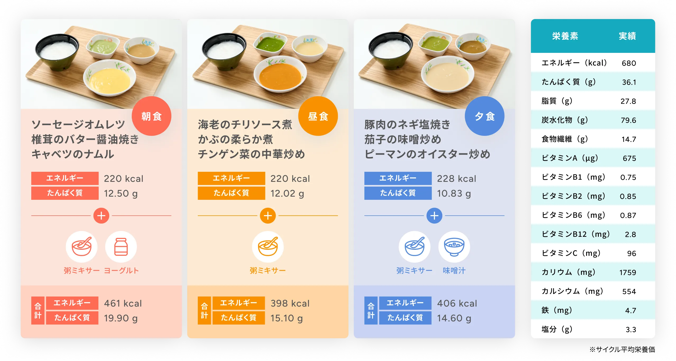 こちらのサンプル献立はそのままでも、さまざまな食種に合わせて展開する上でのベースとしてもお使いいただけます。