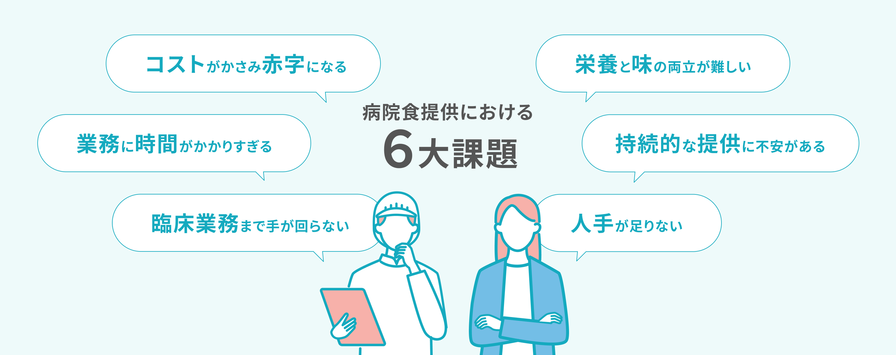 病院給食におけるコスト悪化を改善 メディカデリの病院食サービスでは、人によるチェックや業務が必要な部分など効率化すべきでないところは効率化せず、効率化、省人化できる部分はできうるだけ効率化することで、フードとレイバーの食事提供の2大コストを全体として効率化、適正化し、病院給食のコスト悪化を改善します。